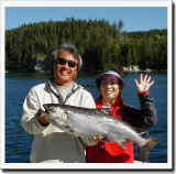 この十年間毎年おこし頂いている北海道の小田様ご一行、今年は釣りは初めてという小田社長のお姉さま、早香枝ご夫妻と共に6名様でお越し頂きました。生憎、漁師の漁の解禁と重なり少々苦戦でしたが、それでもキングサーモン22ポンドをはじめ皆様に楽しんでいただけました。海峡は折りから回遊しているソックアイ(紅鮭)をはじめ、コーホ(銀鮭)、ピンク(カラフト鱒)で、大賑わい。次々に竿先に出るアタリに船上は大忙しでした。 最終日はシャチの群に三回も遭遇し、シャチの全身を現す大ジャンプを目の当りにすることが出来るなど、ジョンストン海峡ならではの野生のショーを見ることが出来ました。「春の海ひねもすのたりのたりかな」という言葉がピッタリというほどのべタ凪の中、「これでサーモンがつれたら最高ね。」と言う早香枝さまの言葉に答えるように15ポンドと22ポンドのキングサーモンもヒット。 「来年もお願い致します。」とご帰国いただきました。 シーズンもいよいよ終盤に入り連日30ポンドクラスの大物キングサーモの釣果の連絡が入ってきています。いよいよプライムタイム、この2週間が楽しみです。 ![]() |