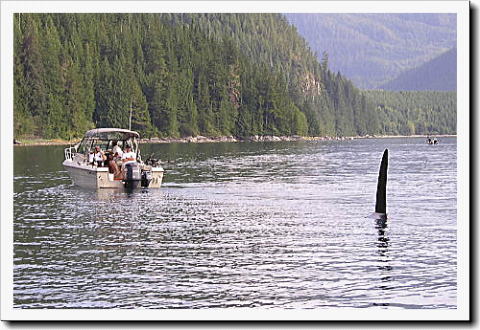 オオッ!キラーホエールがボートの後ろに!・・・と思いきや?ボートに乗っているお客さんはなぜか知らぬそぶり? 実は仲間のガイド-スティーブ(Steve Hills) がアザラシに掛けたサーモンを奪われる被害に連日遭い、苦肉の策で作り上げたキラーホエールのハリボテです。 アザラシの天敵は海のギャングのキラーホエールという観点から、出てきたアイデア。 スケア・クローならぬスケア・シールで、この海域では一躍有名なアザラシプルーフです。 その効用のほどはというと・・・? スティーブのアイデアが効いたのか?サーモンの回遊量が多くなったためアザラシのお腹が一杯になったのか?ここのところアザラシの被害はなくなったようです。 ![]() |