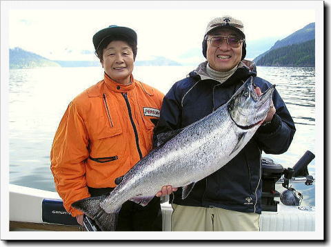 | 5月初めにお越し頂いた横須賀の木村さんご夫妻は、10年程前にキャンベルリバーの釣りを経験されたとのことで、今回は本土側のインレットのキングサーモン釣りにお越しいただきました。5月になって釣れ始めたビュートインレットのキングサーモン釣りは日によってムラがあるものの、奥様共々立派なキングサーモンを釣って頂きました。釣り上げたキングサーモンはどれもサケのトロとも言われる白身のキングサーモンで、「お刺身で頂くのが楽しみ!」とおっしゃっていました。 天候にも恵まれ残雪の残る美しい山々に囲まれた風景と、シーライオン(トド)やブラックベアー(黒クマ)の野生動物を目の当りにしながら楽しい休日を過ごしていただきました。 ビュートインレットのサーモンフィッシングは今月末にピークを迎え6月末まで続きます。 |