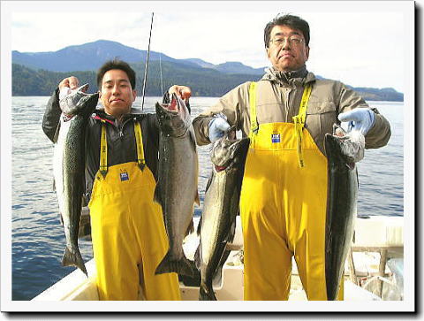 | 神戸からお越しいただいた額田先生と松井様は、釣りバカ日誌のスーさんとハマちゃんのよう!お二人は良く釣りに一緒に出かける釣り友達です。当初は沖縄に釣行を考えていたそうですが、台風の心配もあり思い切ってカナダ!初めての海外の釣りに挑戦です。 弊社のホームページを見て連絡を頂き、早速こちらでホテルを手配。当日は潮の状態を見て前日までの午後の釣りを早朝出発に変更して出船です。 一日目、いきなりアタリがくるのに合わせのタイミングが難しく、なかなか針に乗らずに苦戦。何度かの空振りとバラシの後はタイミングが合い始め、コーホサーモン2尾とチャムサーモン1尾をキープ。6尾のコーホサーモンをリリースするまずまずの釣果でした。 2日目、早朝、額田先生がキングサーモンサーモンをゲット。しかし、後が続かず場所を移動。松井様が2尾のコーホサーモンを釣り上げただけでアタリがなくなり、さらに移動。キャンベルリバーの近場に戻り終了間際に額田先生に2尾のコーホを釣って頂きました。 「今日はキングサーモンサーモン1尾で終わりかと思った。」と額田先生。お土産に2尾、缶詰用に2尾づつと、お二人とも楽しんでいただけたようです。 次回は是非キングサーモンサーモンの時期。6月下旬から7月初めにお越しください。大物がお待ちしております。 |