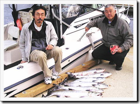 | これでキャンベルリバー何度目でしょうか?というほどサーモン釣りに来ていただいている名古屋の吉田様(左)。今回は京都の佐藤様とご一緒にやってきました。 ここ1週間ほどは不調が続いていたのですが、前日から釣果は一転しコンスタントにつれ始めるようになりました。これも吉田さんの日ごろの行いでしょうか。お二人ともリミット一杯を釣り、更に何尾もリリースする良い釣果に恵まれました。 |